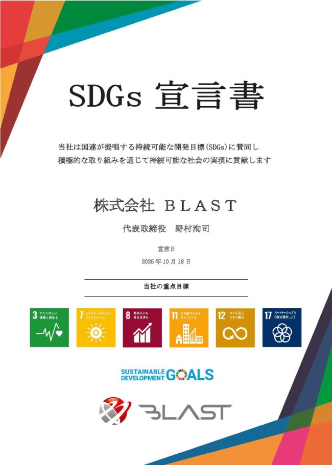 株式会社BLAST、持続可能な地域社会の実現に向けてSDGs宣言書を策定 2025年10月18日、株式会社BLAST(本社:山口県宇部市、代表取締役:野村洵司)は、山口県内の建設・解体・環境事業者として、「SDGs宣言書…