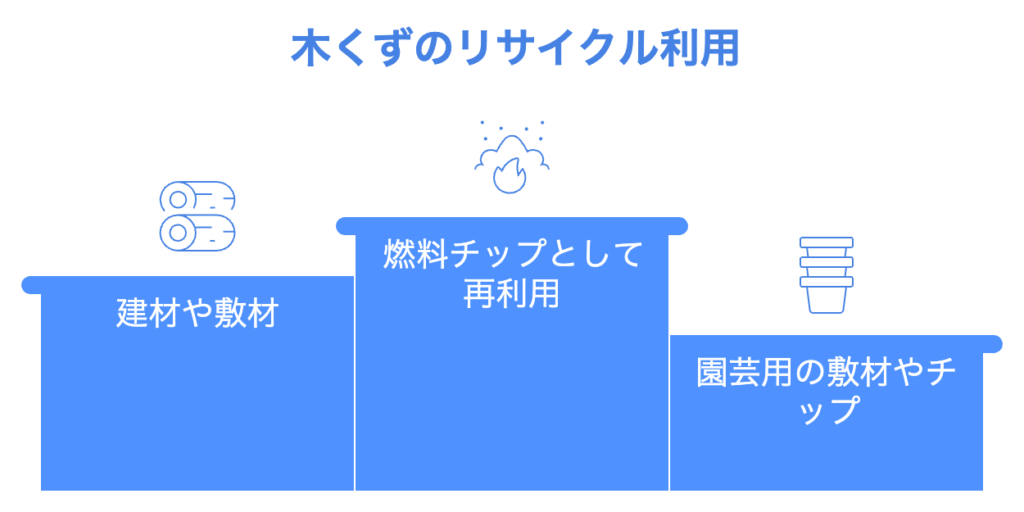 - リサイクル品の利用:燃料チップやリサイクル材として再利用される木くずは、新たな資源として様々な用途で活用されます。